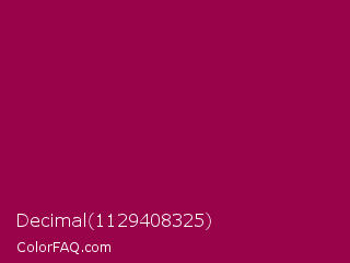 Decimal 1129408325 Color is a dark rose color and the nearest color is Pink Raspberry #980036. Hex code #980349 and RGB value is rgb(152,3,73). In RGB color space, this color is composed of 60% red, 1% green, 29% blue, In CMYK color space, this color is composed of 0% cyan, 98% magenta, 52% yellow , 40% black , In HSL color space, this color has a hue angle of 332° , 96% saturation and 30% lightness.
