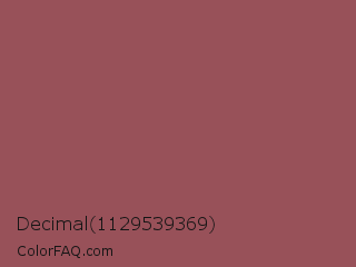 Decimal 1129539369 Color is a normal red color and the nearest color is Middle Red Purple #a55353. Hex code #985159 and RGB value is rgb(152,81,89). In RGB color space, this color is composed of 60% red, 32% green, 35% blue, In CMYK color space, this color is composed of 0% cyan, 47% magenta, 41% yellow , 40% black , In HSL color space, this color has a hue angle of 353° , 30% saturation and 46% lightness.