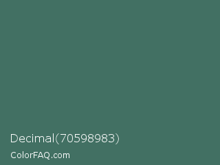 Decimal 70598983 Color is a normal green color and the nearest color is Hookers Green #49796b. Hex code #427063 and RGB value is rgb(66,112,99). In RGB color space, this color is composed of 26% red, 44% green, 39% blue, In CMYK color space, this color is composed of 41% cyan, 0% magenta, 12% yellow , 56% black , In HSL color space, this color has a hue angle of 163° , 26% saturation and 35% lightness.