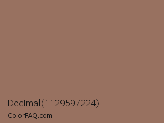 Decimal 1129597224 Color is a normal orange color and the nearest color is Toast #9a6e61. Hex code #987160 and RGB value is rgb(152,113,96). In RGB color space, this color is composed of 60% red, 44% green, 38% blue, In CMYK color space, this color is composed of 0% cyan, 26% magenta, 37% yellow , 40% black , In HSL color space, this color has a hue angle of 18° , 23% saturation and 49% lightness.