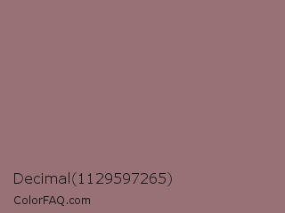 Decimal 1129597265 Color is a normal red color and the nearest color is Bazaar #98777b. Hex code #987177 and RGB value is rgb(152,113,119). In RGB color space, this color is composed of 60% red, 44% green, 47% blue, In CMYK color space, this color is composed of 0% cyan, 26% magenta, 22% yellow , 40% black , In HSL color space, this color has a hue angle of 351° , 16% saturation and 52% lightness.