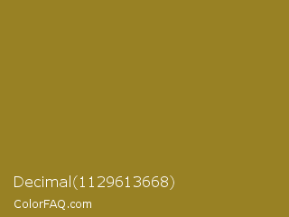 Decimal 1129613668 Color is a normal yellow color and the nearest color is Hacienda #98811b. Hex code #988124 and RGB value is rgb(152,129,36). In RGB color space, this color is composed of 60% red, 51% green, 14% blue, In CMYK color space, this color is composed of 0% cyan, 15% magenta, 76% yellow , 40% black , In HSL color space, this color has a hue angle of 48° , 62% saturation and 37% lightness.