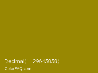 Decimal 1129645858 Color is a dark yellow color and the nearest color is Dark Yellow #9b870c. Hex code #988802 and RGB value is rgb(152,136,2). In RGB color space, this color is composed of 60% red, 53% green, 1% blue, In CMYK color space, this color is composed of 0% cyan, 11% magenta, 99% yellow , 40% black , In HSL color space, this color has a hue angle of 54° , 97% saturation and 30% lightness.