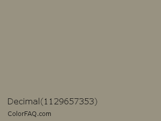Decimal 1129657353 Color is a normal orange color and the nearest color is Gurkha #9a9577. Hex code #989281 and RGB value is rgb(152,146,129). In RGB color space, this color is composed of 60% red, 57% green, 51% blue, In CMYK color space, this color is composed of 0% cyan, 4% magenta, 15% yellow , 40% black , In HSL color space, this color has a hue angle of 44° , 10% saturation and 55% lightness.