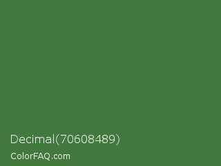 Decimal 70608489 Color is a normal green color and the nearest color is Fern Green #4f7942. Hex code #427a3d and RGB value is rgb(66,122,61). In RGB color space, this color is composed of 26% red, 48% green, 24% blue, In CMYK color space, this color is composed of 46% cyan, 0% magenta, 50% yellow , 52% black , In HSL color space, this color has a hue angle of 115° , 33% saturation and 36% lightness.