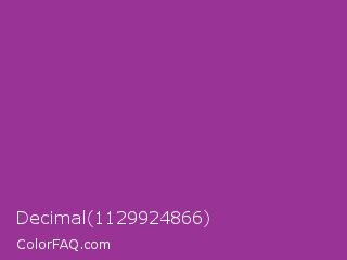 Decimal 1129924866 Color is a normal magenta color and the nearest color is Vivid Violet #803790. Hex code #993496 and RGB value is rgb(153,52,150). In RGB color space, this color is composed of 60% red, 20% green, 59% blue, In CMYK color space, this color is composed of 0% cyan, 66% magenta, 2% yellow , 40% black , In HSL color space, this color has a hue angle of 302° , 49% saturation and 40% lightness.