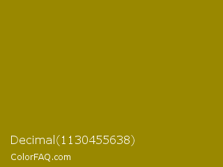 Decimal 1130455638 Color is a dark yellow color and the nearest color is Dark Yellow #9b870c. Hex code #998800 and RGB value is rgb(153,136,0). In RGB color space, this color is composed of 60% red, 53% green, 0% blue, In CMYK color space, this color is composed of 0% cyan, 11% magenta, 100% yellow , 40% black , In HSL color space, this color has a hue angle of 53° , 100% saturation and 30% lightness.