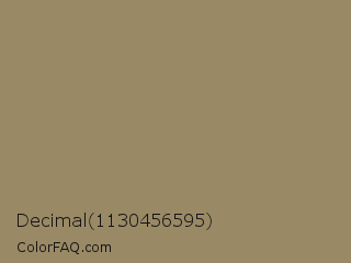Decimal 1130456595 Color is a normal orange color and the nearest color is Arrowtown #948771. Hex code #998965 and RGB value is rgb(153,137,101). In RGB color space, this color is composed of 60% red, 54% green, 40% blue, In CMYK color space, this color is composed of 0% cyan, 10% magenta, 34% yellow , 40% black , In HSL color space, this color has a hue angle of 42° , 20% saturation and 50% lightness.