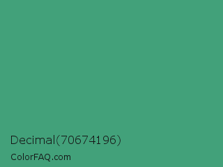 Decimal 70674196 Color is a normal green color and the nearest color is Ocean Green #41aa78. Hex code #42a17a and RGB value is rgb(66,161,122). In RGB color space, this color is composed of 26% red, 63% green, 48% blue, In CMYK color space, this color is composed of 59% cyan, 0% magenta, 24% yellow , 37% black , In HSL color space, this color has a hue angle of 155° , 42% saturation and 45% lightness.