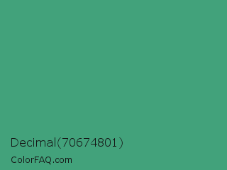 Decimal 70674801 Color is a normal green color and the nearest color is Ocean Green #41aa78. Hex code #42a27b and RGB value is rgb(66,162,123). In RGB color space, this color is composed of 26% red, 64% green, 48% blue, In CMYK color space, this color is composed of 59% cyan, 0% magenta, 24% yellow , 36% black , In HSL color space, this color has a hue angle of 156° , 42% saturation and 45% lightness.