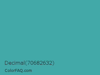 Decimal 70682632 Color is a normal cyan color and the nearest color is Verdigris #43b3ae. Hex code #42a9a8 and RGB value is rgb(66,169,168). In RGB color space, this color is composed of 26% red, 66% green, 66% blue, In CMYK color space, this color is composed of 61% cyan, 0% magenta, 1% yellow , 34% black , In HSL color space, this color has a hue angle of 179° , 44% saturation and 46% lightness.