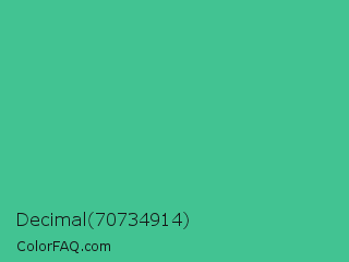 Decimal 70734914 Color is a normal green color and the nearest color is Ocean Green #48bf91. Hex code #42c392 and RGB value is rgb(66,195,146). In RGB color space, this color is composed of 26% red, 76% green, 57% blue, In CMYK color space, this color is composed of 66% cyan, 0% magenta, 25% yellow , 24% black , In HSL color space, this color has a hue angle of 157° , 52% saturation and 51% lightness.