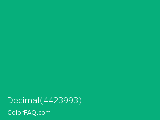 Decimal 4423993 Color is a normal green color and the nearest color is Green Munsell #00a877. Hex code #06af7b and RGB value is rgb(6,175,123). In RGB color space, this color is composed of 2% red, 69% green, 48% blue, In CMYK color space, this color is composed of 97% cyan, 0% magenta, 30% yellow , 31% black , In HSL color space, this color has a hue angle of 162° , 93% saturation and 35% lightness.