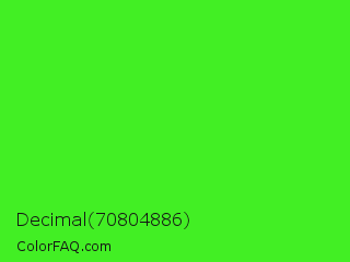 Decimal 70804886 Color is a normal green color and the nearest color is Neon Green #39ff14. Hex code #42ef24 and RGB value is rgb(66,239,36). In RGB color space, this color is composed of 26% red, 94% green, 14% blue, In CMYK color space, this color is composed of 72% cyan, 0% magenta, 85% yellow , 6% black , In HSL color space, this color has a hue angle of 111° , 86% saturation and 54% lightness.