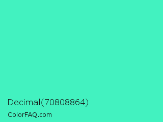Decimal 70808864 Color is a normal green color and the nearest color is Turquoise #40e0d0. Hex code #42f2c0 and RGB value is rgb(66,242,192). In RGB color space, this color is composed of 26% red, 95% green, 75% blue, In CMYK color space, this color is composed of 73% cyan, 0% magenta, 21% yellow , 5% black , In HSL color space, this color has a hue angle of 163° , 87% saturation and 60% lightness.
