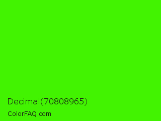 Decimal 70808965 Color is a normal green color and the nearest color is Harlequin #3fff00. Hex code #42f301 and RGB value is rgb(66,243,1). In RGB color space, this color is composed of 26% red, 95% green, 0% blue, In CMYK color space, this color is composed of 73% cyan, 0% magenta, 100% yellow , 5% black , In HSL color space, this color has a hue angle of 104° , 99% saturation and 48% lightness.