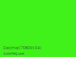 Decimal 70809104 Color is a normal green color and the nearest color is Neon Green #39ff14. Hex code #42f31a and RGB value is rgb(66,243,26). In RGB color space, this color is composed of 26% red, 95% green, 10% blue, In CMYK color space, this color is composed of 73% cyan, 0% magenta, 89% yellow , 5% black , In HSL color space, this color has a hue angle of 109° , 90% saturation and 53% lightness.