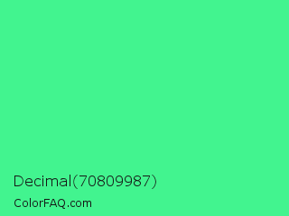 Decimal 70809987 Color is a light green color and the nearest color is Very Light Malachite Green #64e986. Hex code #42f48f and RGB value is rgb(66,244,143). In RGB color space, this color is composed of 26% red, 96% green, 56% blue, In CMYK color space, this color is composed of 73% cyan, 0% magenta, 41% yellow , 4% black , In HSL color space, this color has a hue angle of 146° , 89% saturation and 61% lightness.