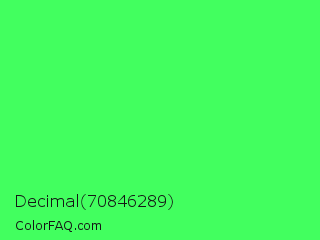 Decimal 70846289 Color is a light green color and the nearest color is Screamin Green #66ff66. Hex code #42ff5f and RGB value is rgb(66,255,95). In RGB color space, this color is composed of 26% red, 100% green, 37% blue, In CMYK color space, this color is composed of 74% cyan, 0% magenta, 63% yellow , 0% black , In HSL color space, this color has a hue angle of 129° , 100% saturation and 63% lightness.
