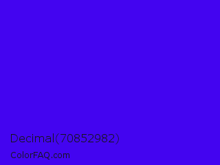 Decimal 70852982 Color is a normal indigo color and the nearest color is Electric Ultramarine #3f00ff. Hex code #4304f0 and RGB value is rgb(67,4,240). In RGB color space, this color is composed of 26% red, 2% green, 94% blue, In CMYK color space, this color is composed of 72% cyan, 98% magenta, 0% yellow , 6% black , In HSL color space, this color has a hue angle of 256° , 97% saturation and 48% lightness.