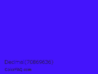 Decimal 70869636 Color is a normal indigo color and the nearest color is Han Purple #5218fa. Hex code #4314fc and RGB value is rgb(67,20,252). In RGB color space, this color is composed of 26% red, 8% green, 99% blue, In CMYK color space, this color is composed of 73% cyan, 92% magenta, 0% yellow , 1% black , In HSL color space, this color has a hue angle of 252° , 97% saturation and 53% lightness.