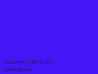 Decimal 70873157 Color is a normal indigo color and the nearest color is Han Purple #5218fa. Hex code #4317f5 and RGB value is rgb(67,23,245). In RGB color space, this color is composed of 26% red, 9% green, 96% blue, In CMYK color space, this color is composed of 73% cyan, 91% magenta, 0% yellow , 4% black , In HSL color space, this color has a hue angle of 252° , 92% saturation and 53% lightness.