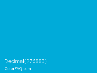 Decimal 276883 Color is a normal cyan color and the nearest color is Cerulean #02a4d3. Hex code #00abd9 and RGB value is rgb(0,171,217). In RGB color space, this color is composed of 0% red, 67% green, 85% blue, In CMYK color space, this color is composed of 100% cyan, 21% magenta, 0% yellow , 15% black , In HSL color space, this color has a hue angle of 193° , 100% saturation and 43% lightness.