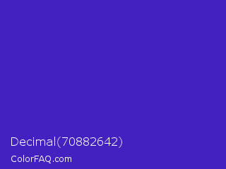 Decimal 70882642 Color is a normal indigo color and the nearest color is Interdimensional Blue #360ccc. Hex code #4321c0 and RGB value is rgb(67,33,192). In RGB color space, this color is composed of 26% red, 13% green, 75% blue, In CMYK color space, this color is composed of 65% cyan, 83% magenta, 0% yellow , 25% black , In HSL color space, this color has a hue angle of 253° , 71% saturation and 44% lightness.