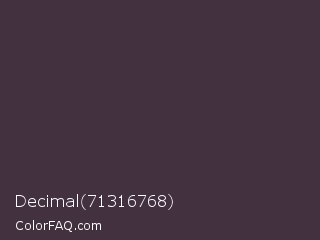 Decimal 71316768 Color is a dark magenta color and the nearest color is Ship Gray #3e3a44. Hex code #433140 and RGB value is rgb(67,49,64). In RGB color space, this color is composed of 26% red, 19% green, 25% blue, In CMYK color space, this color is composed of 0% cyan, 27% magenta, 4% yellow , 74% black , In HSL color space, this color has a hue angle of 310° , 16% saturation and 23% lightness.