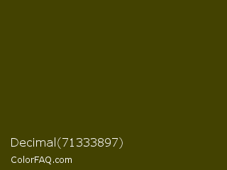 Decimal 71333897 Color is a very dark yellow color and the nearest color is Bronze Olive #4e420c. Hex code #434201 and RGB value is rgb(67,66,1). In RGB color space, this color is composed of 26% red, 26% green, 0% blue, In CMYK color space, this color is composed of 0% cyan, 1% magenta, 99% yellow , 74% black , In HSL color space, this color has a hue angle of 59° , 97% saturation and 13% lightness.