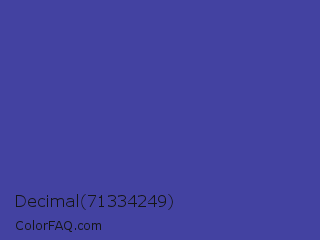 Decimal 71334249 Color is a normal indigo color and the nearest color is Gigas #523c94. Hex code #4342a1 and RGB value is rgb(67,66,161). In RGB color space, this color is composed of 26% red, 26% green, 63% blue, In CMYK color space, this color is composed of 58% cyan, 59% magenta, 0% yellow , 37% black , In HSL color space, this color has a hue angle of 241° , 42% saturation and 45% lightness.
