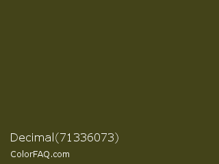 Decimal 71336073 Color is a very dark yellow color and the nearest color is Thatch Green #403d19. Hex code #434319 and RGB value is rgb(67,67,25). In RGB color space, this color is composed of 26% red, 26% green, 10% blue, In CMYK color space, this color is composed of 0% cyan, 0% magenta, 63% yellow , 74% black , In HSL color space, this color has a hue angle of 60° , 46% saturation and 18% lightness.