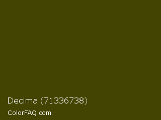 Decimal 71336738 Color is a very dark yellow color and the nearest color is Bronze Olive #4e420c. Hex code #434402 and RGB value is rgb(67,68,2). In RGB color space, this color is composed of 26% red, 27% green, 1% blue, In CMYK color space, this color is composed of 1% cyan, 0% magenta, 97% yellow , 73% black , In HSL color space, this color has a hue angle of 61° , 94% saturation and 14% lightness.