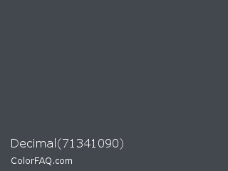 Decimal 71341090 Color is a dark blue color and the nearest color is Outer Space #414a4c. Hex code #43484e and RGB value is rgb(67,72,78). In RGB color space, this color is composed of 26% red, 28% green, 31% blue, In CMYK color space, this color is composed of 14% cyan, 8% magenta, 0% yellow , 69% black , In HSL color space, this color has a hue angle of 213° , 8% saturation and 28% lightness.