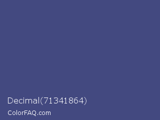 Decimal 71341864 Color is a normal blue color and the nearest color is East Bay #414c7d. Hex code #434980 and RGB value is rgb(67,73,128). In RGB color space, this color is composed of 26% red, 29% green, 50% blue, In CMYK color space, this color is composed of 48% cyan, 43% magenta, 0% yellow , 50% black , In HSL color space, this color has a hue angle of 234° , 31% saturation and 38% lightness.