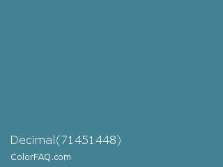 Decimal 71451448 Color is a normal cyan color and the nearest color is Smalt Blue #51808f. Hex code #438292 and RGB value is rgb(67,130,146). In RGB color space, this color is composed of 26% red, 51% green, 57% blue, In CMYK color space, this color is composed of 54% cyan, 11% magenta, 0% yellow , 43% black , In HSL color space, this color has a hue angle of 192° , 37% saturation and 42% lightness.