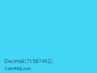 Decimal 71587462 Color is a light cyan color and the nearest color is Picton Blue #45b1e8. Hex code #43d5f6 and RGB value is rgb(67,213,246). In RGB color space, this color is composed of 26% red, 84% green, 96% blue, In CMYK color space, this color is composed of 73% cyan, 13% magenta, 0% yellow , 4% black , In HSL color space, this color has a hue angle of 191° , 91% saturation and 61% lightness.
