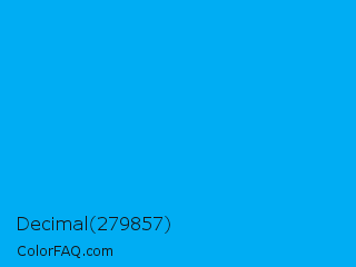 Decimal 279857 Color is a normal blue color and the nearest color is Vivid Cerulean #00aaee. Hex code #00adf3 and RGB value is rgb(0,173,243). In RGB color space, this color is composed of 0% red, 68% green, 95% blue, In CMYK color space, this color is composed of 100% cyan, 29% magenta, 0% yellow , 5% black , In HSL color space, this color has a hue angle of 197° , 100% saturation and 48% lightness.