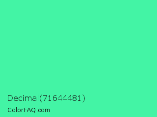 Decimal 71644481 Color is a light green color and the nearest color is Eucalyptus #44d7a8. Hex code #43f4a5 and RGB value is rgb(67,244,165). In RGB color space, this color is composed of 26% red, 96% green, 65% blue, In CMYK color space, this color is composed of 73% cyan, 0% magenta, 32% yellow , 4% black , In HSL color space, this color has a hue angle of 153° , 89% saturation and 61% lightness.