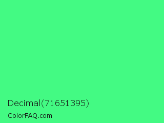 Decimal 71651395 Color is a light green color and the nearest color is Very Light Malachite Green #64e986. Hex code #43fa83 and RGB value is rgb(67,250,131). In RGB color space, this color is composed of 26% red, 98% green, 51% blue, In CMYK color space, this color is composed of 73% cyan, 0% magenta, 48% yellow , 2% black , In HSL color space, this color has a hue angle of 141° , 95% saturation and 62% lightness.