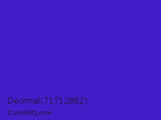 Decimal 71712882 Color is a normal indigo color and the nearest color is Interdimensional Blue #360ccc. Hex code #441dc8 and RGB value is rgb(68,29,200). In RGB color space, this color is composed of 27% red, 11% green, 78% blue, In CMYK color space, this color is composed of 66% cyan, 86% magenta, 0% yellow , 22% black , In HSL color space, this color has a hue angle of 254° , 75% saturation and 45% lightness.
