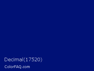 Decimal 17520 Color is a dark blue color and the nearest color is Dark Imperial Blue #00147e. Hex code #001176 and RGB value is rgb(0,17,118). In RGB color space, this color is composed of 0% red, 7% green, 46% blue, In CMYK color space, this color is composed of 100% cyan, 86% magenta, 0% yellow , 54% black , In HSL color space, this color has a hue angle of 231° , 100% saturation and 23% lightness.