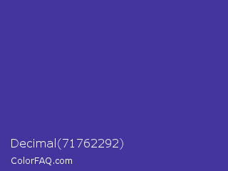 Decimal 71762292 Color is a normal indigo color and the nearest color is Blue Pigment #333399. Hex code #44359e and RGB value is rgb(68,53,158). In RGB color space, this color is composed of 27% red, 21% green, 62% blue, In CMYK color space, this color is composed of 57% cyan, 66% magenta, 0% yellow , 38% black , In HSL color space, this color has a hue angle of 249° , 50% saturation and 41% lightness.