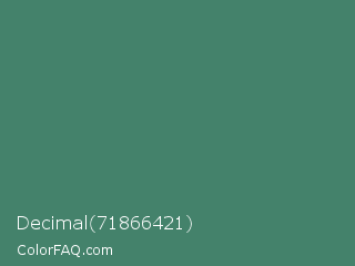 Decimal 71866421 Color is a normal green color and the nearest color is Viridian #40826d. Hex code #44826b and RGB value is rgb(68,130,107). In RGB color space, this color is composed of 27% red, 51% green, 42% blue, In CMYK color space, this color is composed of 48% cyan, 0% magenta, 18% yellow , 49% black , In HSL color space, this color has a hue angle of 158° , 31% saturation and 39% lightness.