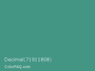 Decimal 71911808 Color is a normal cyan color and the nearest color is Zomp #39a78e. Hex code #449684 and RGB value is rgb(68,150,132). In RGB color space, this color is composed of 27% red, 59% green, 52% blue, In CMYK color space, this color is composed of 55% cyan, 0% magenta, 12% yellow , 41% black , In HSL color space, this color has a hue angle of 167° , 38% saturation and 43% lightness.