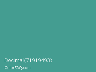 Decimal 71919493 Color is a normal cyan color and the nearest color is Zomp #39a78e. Hex code #449d91 and RGB value is rgb(68,157,145). In RGB color space, this color is composed of 27% red, 62% green, 57% blue, In CMYK color space, this color is composed of 57% cyan, 0% magenta, 8% yellow , 38% black , In HSL color space, this color has a hue angle of 172° , 40% saturation and 44% lightness.