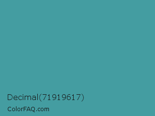 Decimal 71919617 Color is a normal cyan color and the nearest color is Keppel #3ab09e. Hex code #449da1 and RGB value is rgb(68,157,161). In RGB color space, this color is composed of 27% red, 62% green, 63% blue, In CMYK color space, this color is composed of 58% cyan, 2% magenta, 0% yellow , 37% black , In HSL color space, this color has a hue angle of 183° , 41% saturation and 45% lightness.