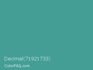 Decimal 71921733 Color is a normal cyan color and the nearest color is Zomp #39a78e. Hex code #449e95 and RGB value is rgb(68,158,149). In RGB color space, this color is composed of 27% red, 62% green, 58% blue, In CMYK color space, this color is composed of 57% cyan, 0% magenta, 6% yellow , 38% black , In HSL color space, this color has a hue angle of 174° , 40% saturation and 44% lightness.