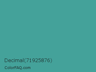 Decimal 71925876 Color is a normal cyan color and the nearest color is Zomp #39a78e. Hex code #44a29a and RGB value is rgb(68,162,154). In RGB color space, this color is composed of 27% red, 64% green, 60% blue, In CMYK color space, this color is composed of 58% cyan, 0% magenta, 5% yellow , 36% black , In HSL color space, this color has a hue angle of 175° , 41% saturation and 45% lightness.