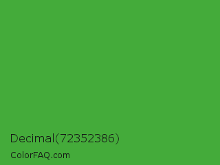 Decimal 72352386 Color is a normal green color and the nearest color is Apple #4fa83d. Hex code #44ab3a and RGB value is rgb(68,171,58). In RGB color space, this color is composed of 27% red, 67% green, 23% blue, In CMYK color space, this color is composed of 60% cyan, 0% magenta, 66% yellow , 33% black , In HSL color space, this color has a hue angle of 115° , 49% saturation and 45% lightness.